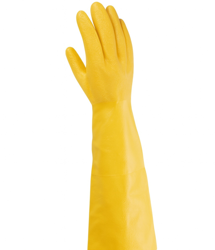 Een extreem duurzame werkhandschoen die volledige armbescherming biedt tegen diverse risico's. Dankzij de volledige nitrilcoating en een extra versteviging op de handpalm is deze handschoen uitstekend bestand tegen olie, chemicaliën en schurende materialen. De verlengde mouw van 65cm blijft goed op zijn plek zitten door een elastische rand, terwijl de antibacteriële en geurwerende eigenschappen zorgen voor comfort bij langdurig gebruik. De ruwe afwerking bevordert grip en flexibiliteit.